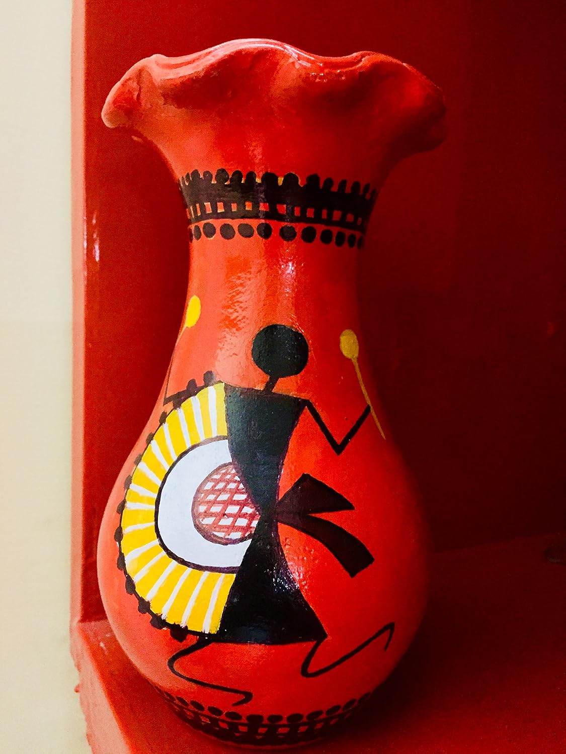 Buy Mittibazaar ARTISAN HANDCRAFTED HANDMADE Flower Vase Terracotta hand painted EARTHENWARE orange color warli art drum playing dancing figure CREATIVE CONTEMPORARY HOME DECOR TABLE TOP DECORATIVE CENTERPIECE flower POT Online at Low